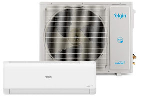 Na área de climatização, a Elgin apresenta modelos de ar-condicionado, climatizadores e cortinas de ar. O destaque é o Eco Inverter 3, com motor BLDC e classificação energética A no Inmetro. O modelo possui conectividade Wi-Fi por meio do aplicativo Elgin Smart, está disponível nas capacidades de 9.000, 12.000, 18.000, 24.000 e 30.000 BTUs, nas versões frio ou quente-frio, em 220V. A garantia informada é de três anos para o produto e dez anos para o compressor.