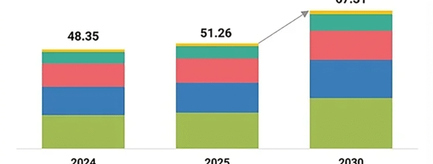 Apesar do peso relativo menor, a América do Sul acompanha a tendência global de expansão do setor. A elevação do valor total do mercado mundial — de US$ 48,35 bilhões em 2024 para US$ 67,31 bilhões em 2030 — indica crescimento também em termos absolutos na região, ainda que sem mudança significativa em sua participação percentual no conjunto regional analisado.